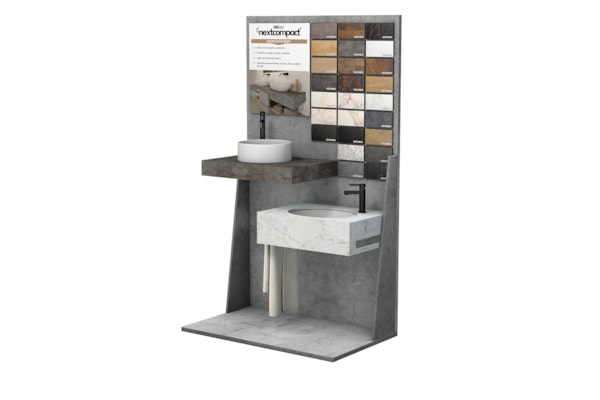 NextCompact koupelnový stojan s informační tabulí a 25 vzorky. Až Váš souhrn objednávek bude 78 000 Kč, částka za stojan Vám bude vrácena zpátky.